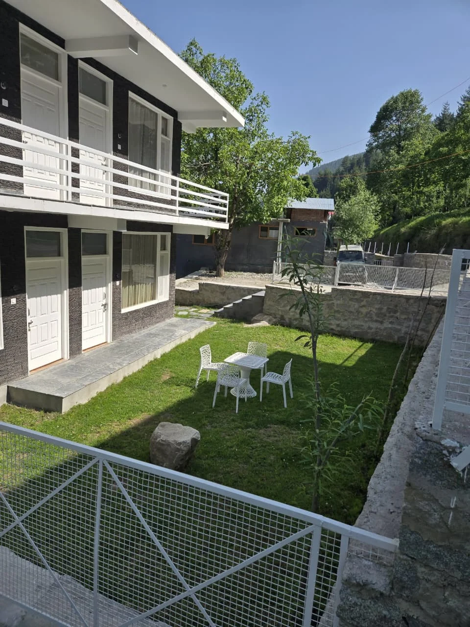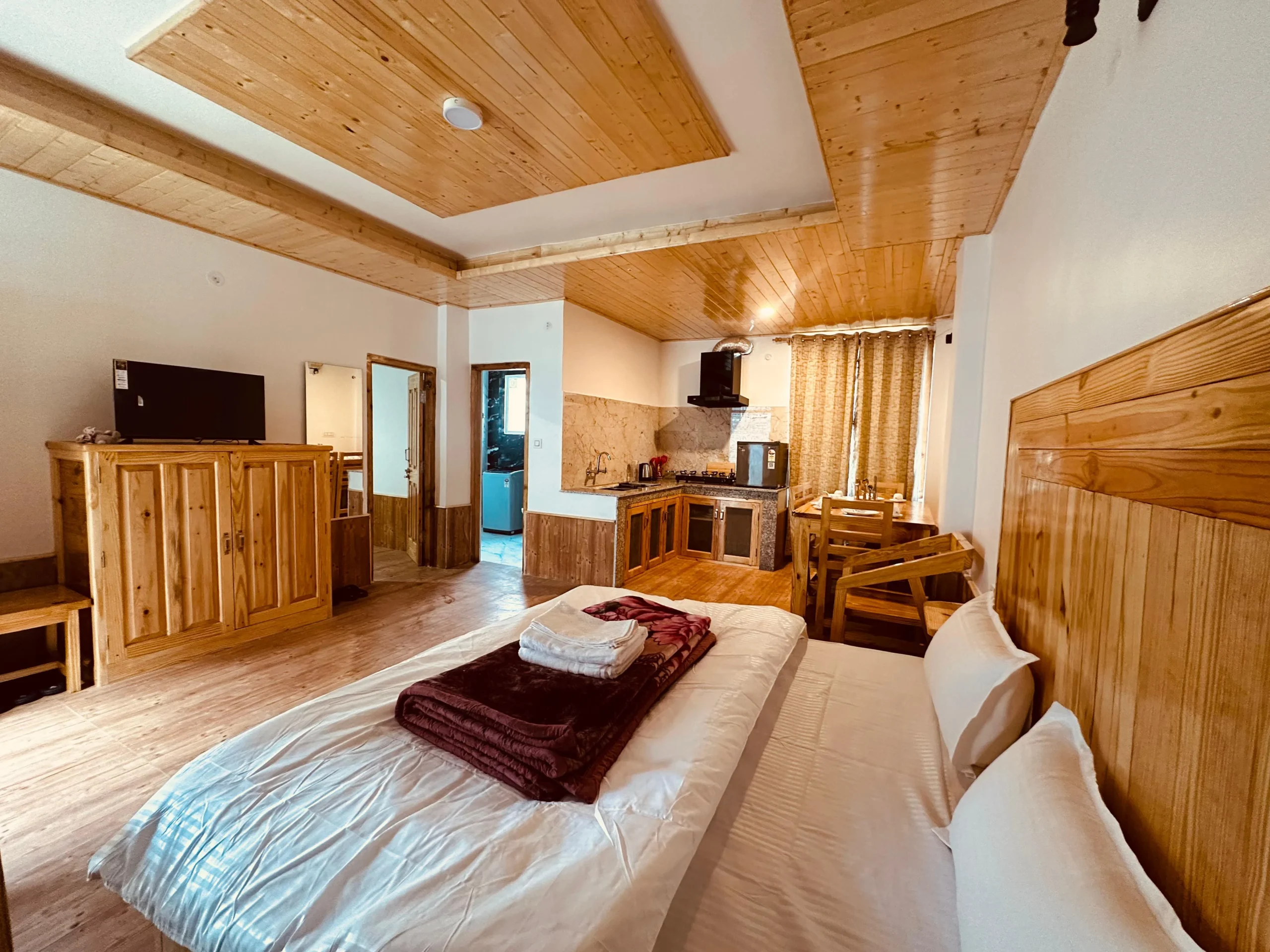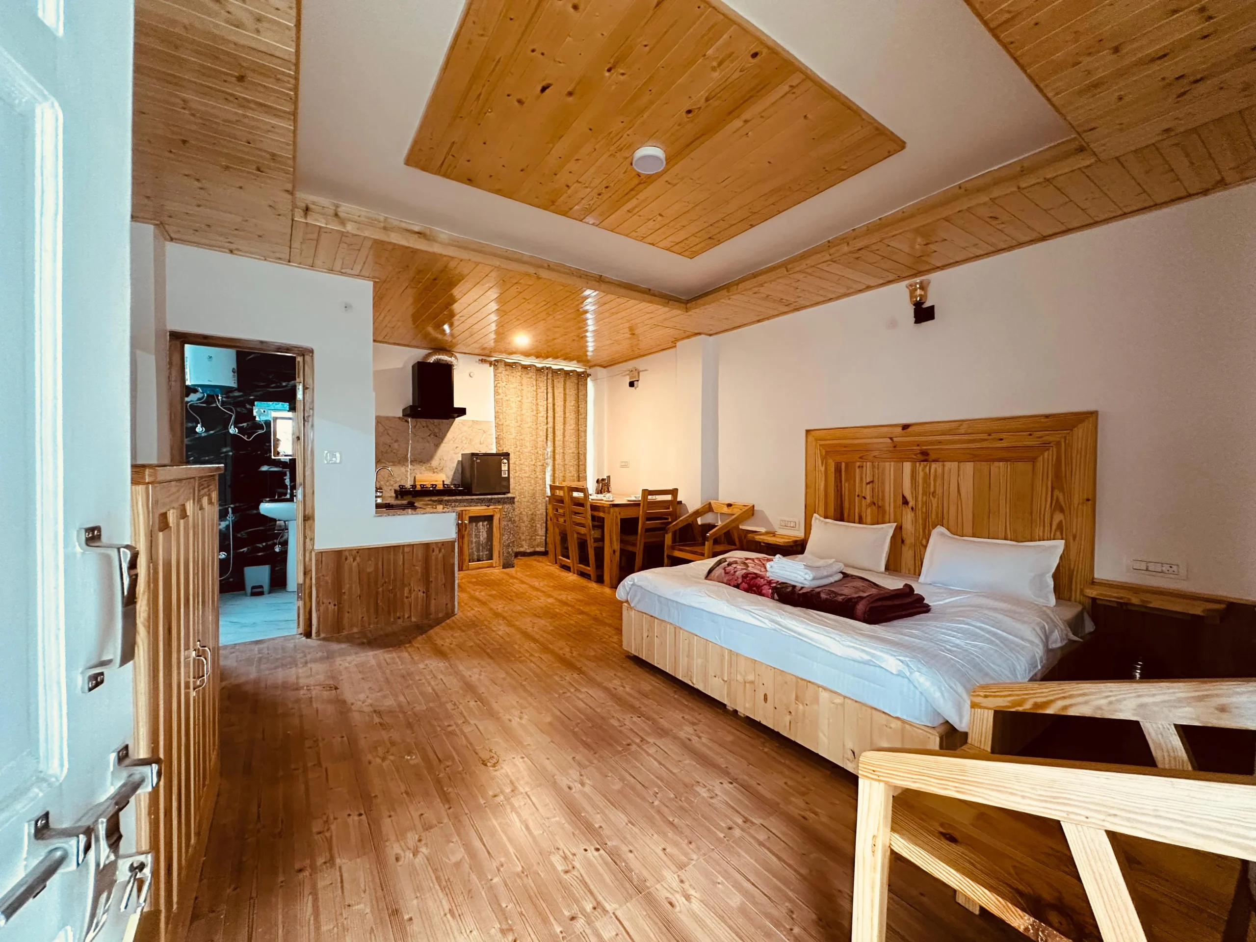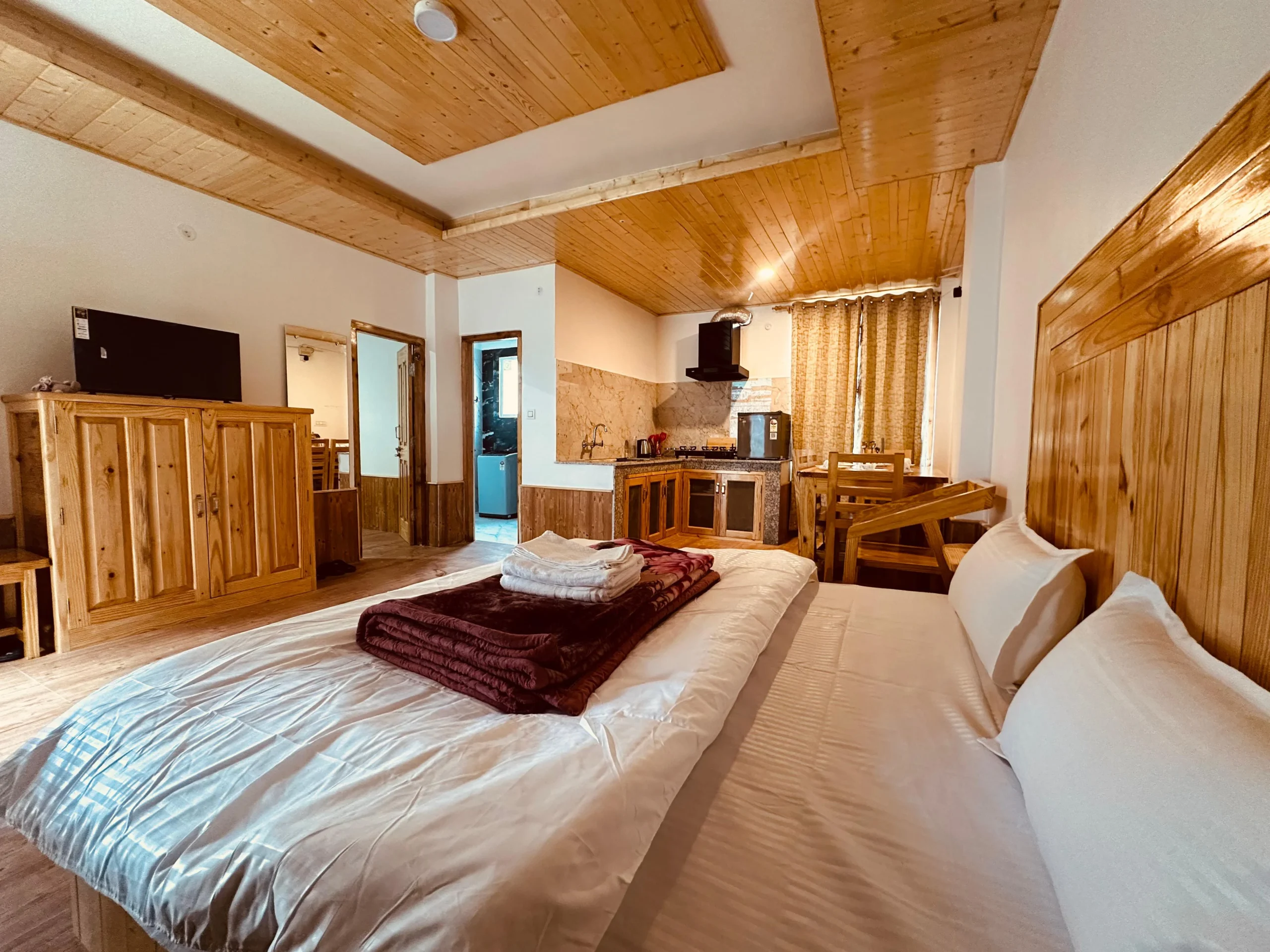 Escape to “The Stone Hedge,” where luxury meets nature. Our newly constructed exquisite two-bedroom ground floor feature spacious bedrooms with attached washrooms for privacy. Enjoy a fully equipped kitchen and a cozy dining area, perfect for family meals.The stylish living space invites relaxation and entertainment. Step outside to a beautiful front lawn for sun-soaking or unwind in the barbeque area, all while taking in stunning views of Rohtang Pass and the Pir-Panjal mountains.