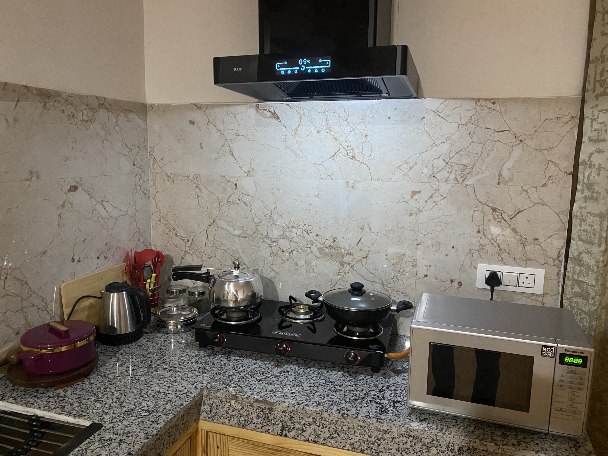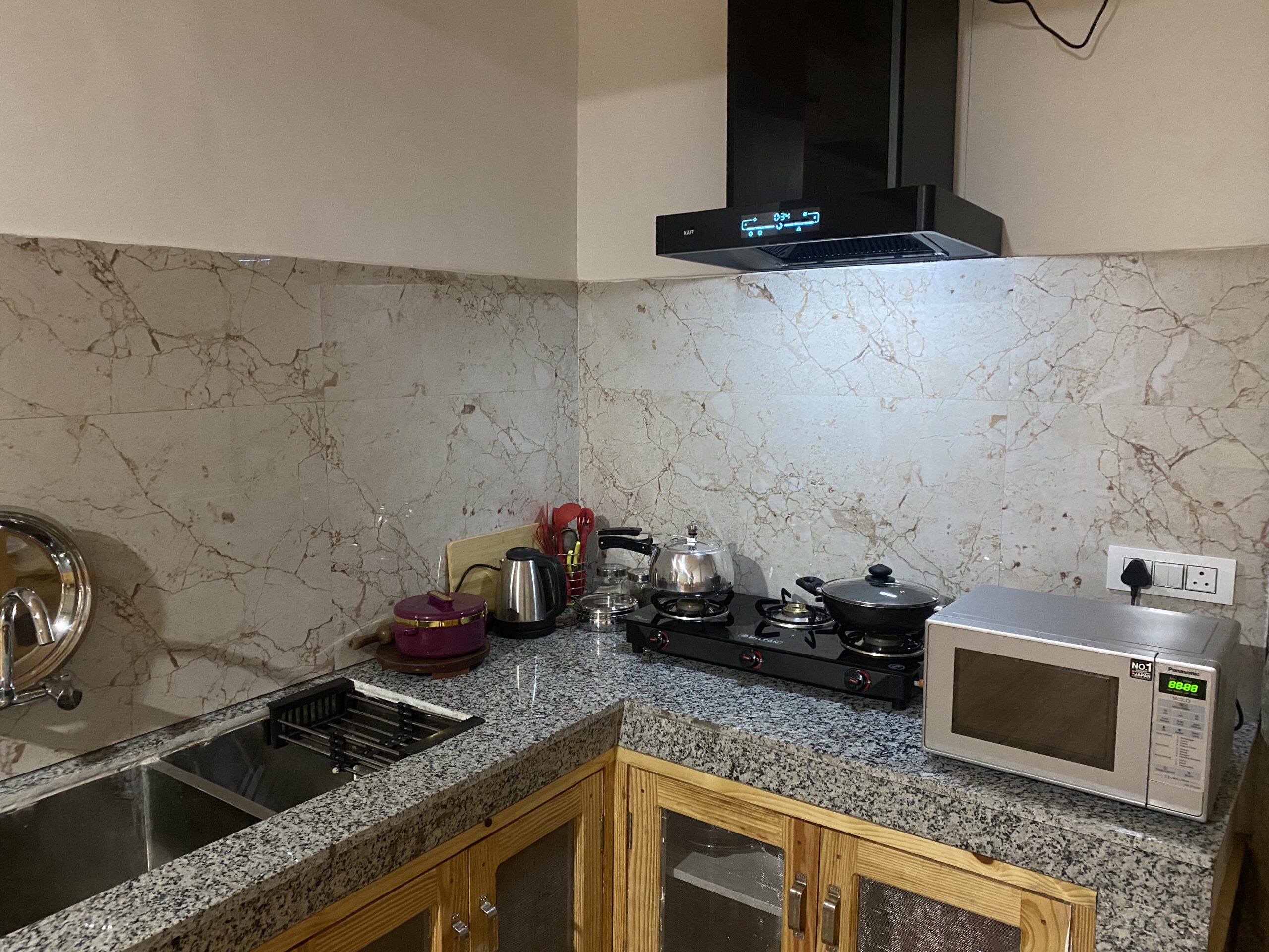 ~ Fully Furnished Kitchen with triple burner LPG gas stove, microwave, refrigerator , all kitchen utensils.